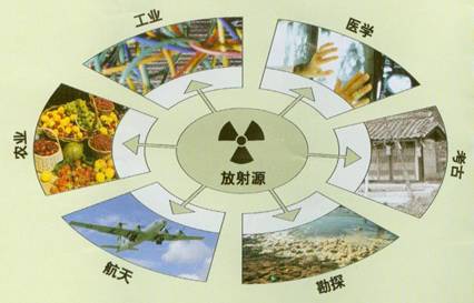 在医学方面放射源广泛用于医学诊断、治疗和消毒灭菌。在农业方面用于辐照育种,可以改良品质,增加产量,还可用于灭菌保鲜等。在工业方面可用于石油、煤炭等资源勘探,矿石成份分析,工业探伤、无损检测、材料改性和料位、密度、厚度测量等。放射源还可用于人造卫星供电,火灾烟雾报警,污水治理等。